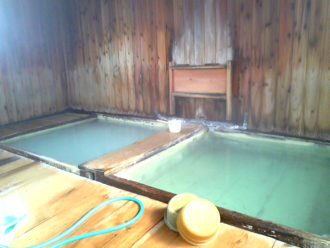 奥塩原新湯温泉の共同浴場の一つ寺の湯です。奥の湯船と手前の湯船ではお湯の色が違いますのがおわかりになりますでしょうか?